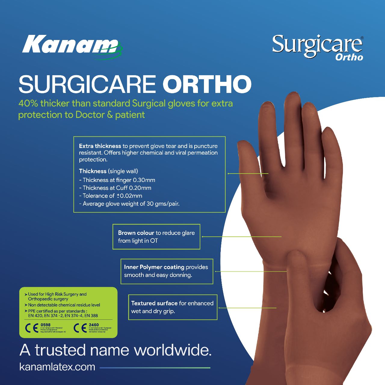 - 40% thicker than the standard surgical glove to withstand rigorous Orthopaedic Surgery and for Protection in High Risk and Trauma.